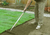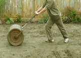 Die so planierte Fläche verdichten Sie nun mit einer schweren Rasenwalze und harken den Boden dann gleich wieder leicht auf, so dass ein feinrauher Untergrund entsteht.